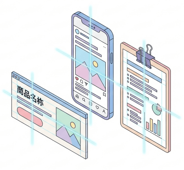 見る人は、ほんの数ピクセルのズレから、無意識に散らかった印象を受け取ります。感覚に頼らず、明確な基準線にしっかりと乗っているかを確認しましょう。
